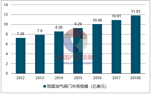 3、油氣領域2017年我國天然氣產量為1490億立方米,《能源發展戰略行動計劃(2014-2020年)》指出:努力建設8個年產量百億立方米級以上的大型天然氣生產基地;到2020年,累計新增常規天然氣探明地質儲量5.5萬億立方米,年產常規天然氣1,850億立方米。國內油氣管線的投資將帶動油氣管線用工業閥門市場規模的持續擴張。據預計,到2018年我國油氣閥門需求規模將達到11.83億美元,年均增速約為8.5%。